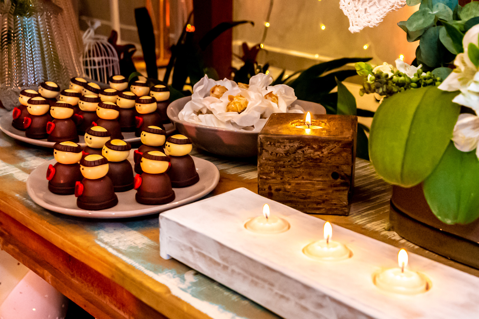 Um destaque especial para as plaquinhas de identificação das mesas dos convidados. Ao invés de números, nomes de doces deliciosos (brigadeiro, chocolate, pudim etc.) encantaram os amigos e familiares, justificando ainda mais a doce personalidade do casal que dentre as escolhas optou por uma mesa posta simplificada e casual composta por caminhos de mesa, sousplat de ratan, guardanapo branco de tecido com um lindo raminho de alecrim, taças para água e no centro pequenos vasinhos de flores mistas.