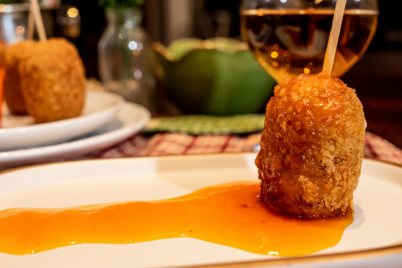 Massa a base de abóbora, recheada com carne-seca cremosa e camada crocante por fora, a combinação com geleia de pimenta amarela torna o sabor surpreendente!